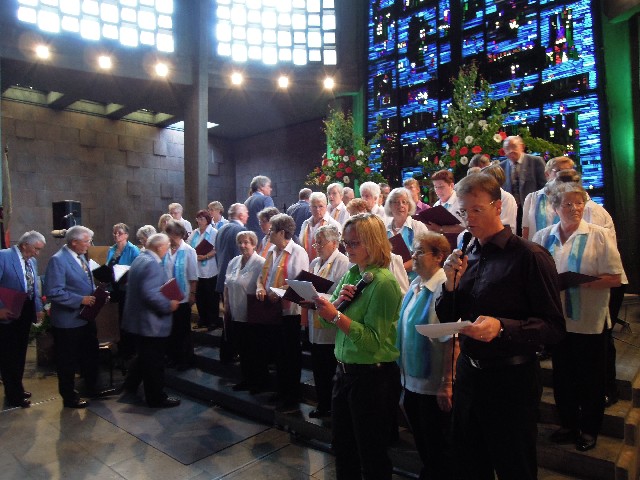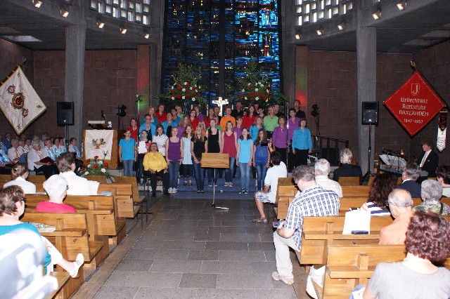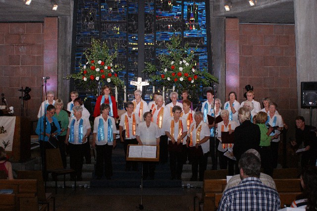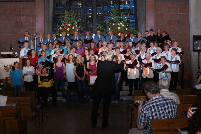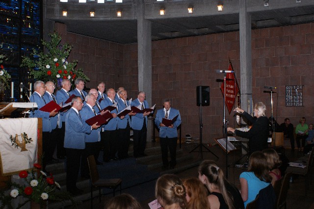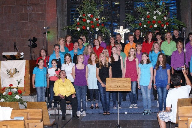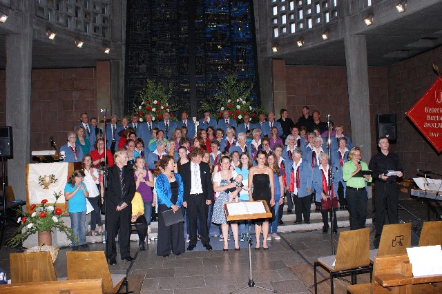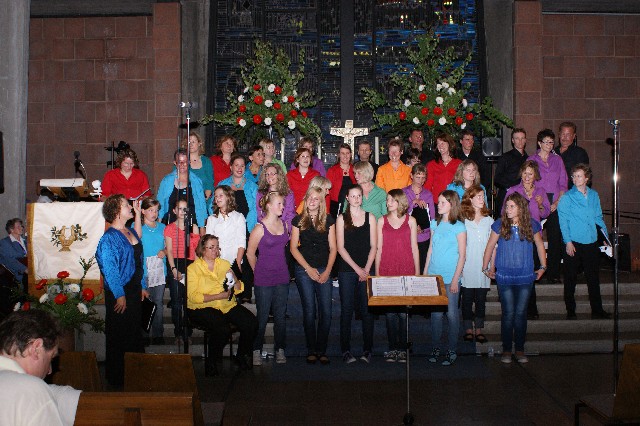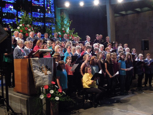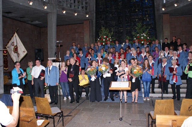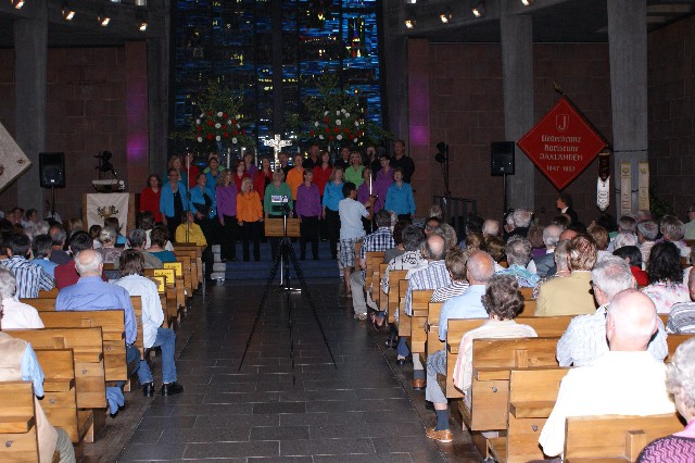 Durchs Musikprogramm begleitete Hanna Hufnagel die anspruchsvolle Chorliteratur am Piano. Den Übergang zwischen den einzelnen Werken meisterten unsere bewährten Moderatoren Stefanie Kuhlmann und Michael Wagner auf souveräne Art. Gesangs-Soloeinlagen durch Klarissa Wagner, Rita Huber-Süß, Ralf Heckner und dessen Frau Henrike Nonnenmann-Heckner sowie die Trompetenbegleitung durch Alexander Maier bereicherten das Musikprogramm. Optische Untermalung fand das Ereignis einerseits durch die geschichtsträchtigen, handgearbeiteten Sängerfahnen im Vordergrund des Altarraums, die natürlich zu diesem Anlass nicht fehlen durften, andererseits durch dezente, moderne Lichteffekte im hinteren Bereich des Altarraums, seitlich der bunten Fensterfronten an die Wand projiziert, angepasst an die Klänge der Musik. So konnten ohne Weiteres traditionelle und moderne Elemente "unter einem Dach" harmonisch nebeneinander stehen - schöne Beiträge passend zum Motto des Abends.