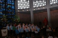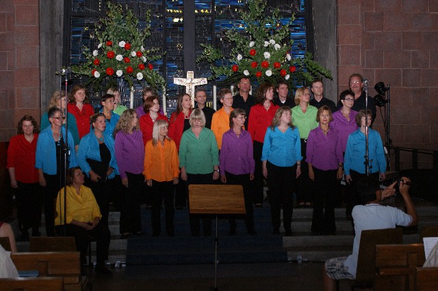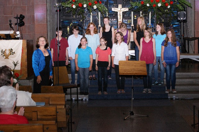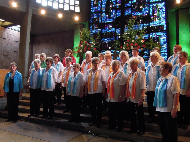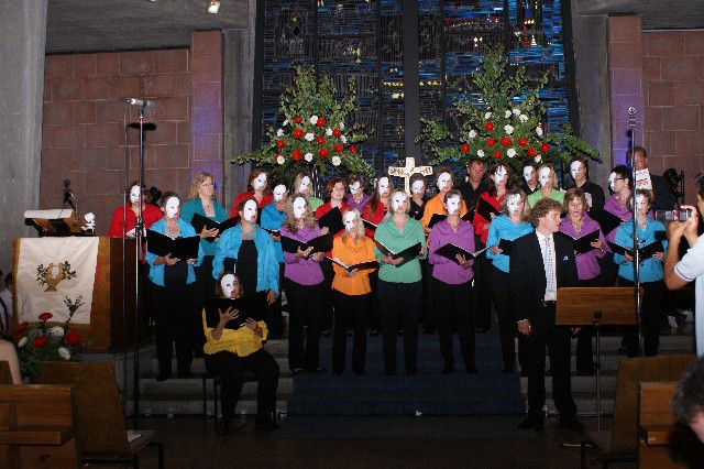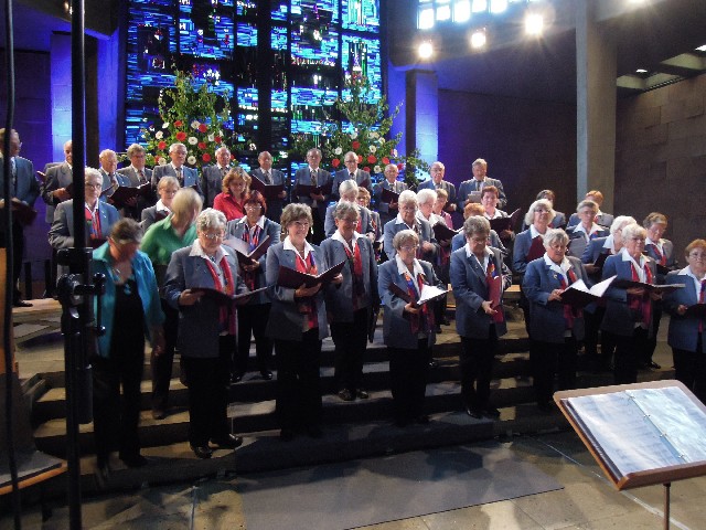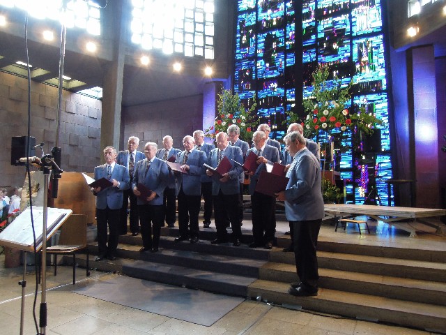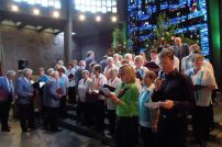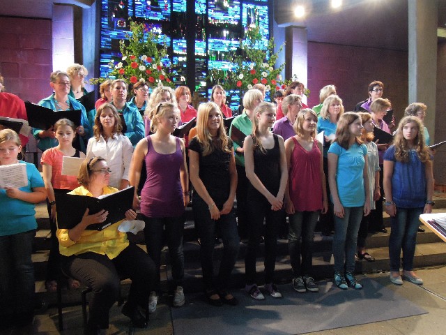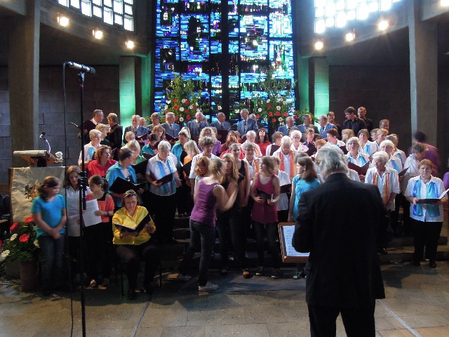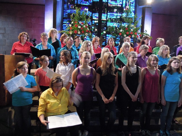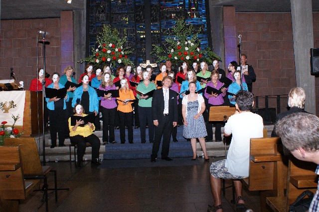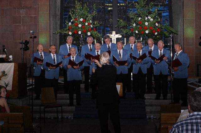 Durchs Musikprogramm begleitete Hanna Hufnagel die anspruchsvolle Chorliteratur am Piano. Den Übergang zwischen den einzelnen Werken meisterten unsere bewährten Moderatoren Stefanie Kuhlmann und Michael Wagner auf souveräne Art. Gesangs-Soloeinlagen durch Klarissa Wagner, Rita Huber-Süß, Ralf Heckner und dessen Frau Henrike Nonnenmann-Heckner sowie die Trompetenbegleitung durch Alexander Maier bereicherten das Musikprogramm. Optische Untermalung fand das Ereignis einerseits durch die geschichtsträchtigen, handgearbeiteten Sängerfahnen im Vordergrund des Altarraums, die natürlich zu diesem Anlass nicht fehlen durften, andererseits durch dezente, moderne Lichteffekte im hinteren Bereich des Altarraums, seitlich der bunten Fensterfronten an die Wand projiziert, angepasst an die Klänge der Musik. So konnten ohne Weiteres traditionelle und moderne Elemente "unter einem Dach" harmonisch nebeneinander stehen - schöne Beiträge passend zum Motto des Abends.