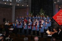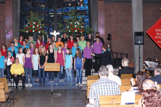 Das Musikprogramm wurde eröffnet mit dem Lied "Herr, Deine Güte reicht so weit", vorgetragen vom Männerchor - so wie die Geschichte des Vereins als reiner Männergesangverein begann und auch sehr lange, bis 1985, andauerte. Nach diesem Eröffnungslied hielt der 1. Vorsitzende Edgar Ganz eine kurze Begrüßungsrede. Inzwischen verfügt der Liederkranz Daxlanden jedoch über weitere Chöre: der Frauenchor, der gemischte Chor (Frauen- und Männerchor), der moderne Chor "Modern Voices", der Jugendchor "Singing Teens" und der Kinderchor "Liederspatzen". Die verschiedenen Chöre präsentierten sich mit verschiedensten Liedbeiträgen quer durch die Musikgeschichte: Der Jugendchor mit seinem beliebten "Hallelujah" von Leonard Cohen und "Defying gravity" aus dem Musical "Wicked", die "Modern Voices" mit Gospels, Spirituals und mehreren Stücken aus verschiedenen modernen Musicals, teilweise gemeinsam mit den "Singing Teens". Der Frauenchor, der Männerchor und der gemischte Chor trugen Volkslieder, klassische und sakrale Musik vor. Auch traten die ca. 80 Sängerinnen und Sänger gemeinsam als großer Chor auf für "Kyrie" von John Leavitt, für "Gloria" von Antonio Vivaldi und für den bekannten Kanon "Dona nobis pacem" als Abschlusslied und symbolisierten so die Verbindung zwischen den einzelnen Chören als Gesamtverein.